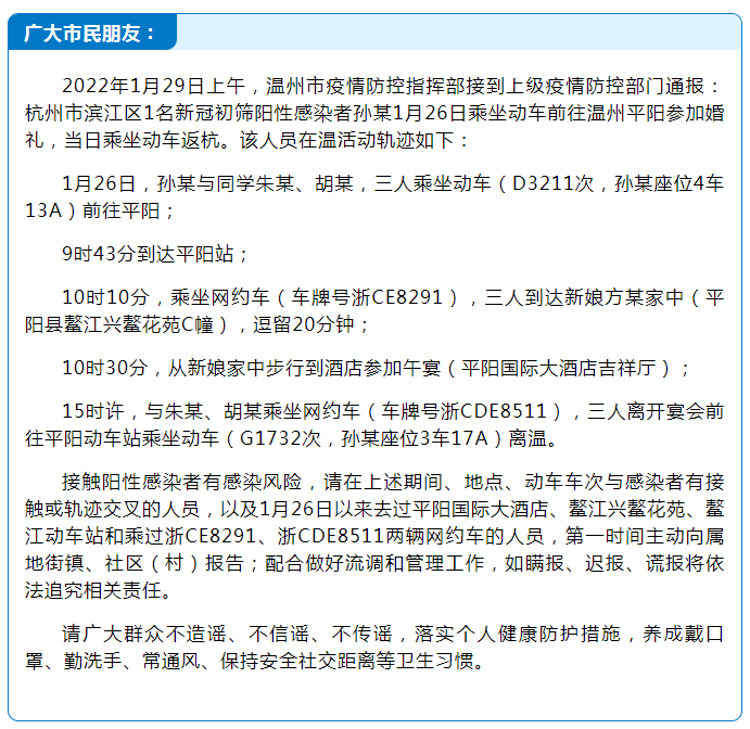 请在上述时间段与病例同乘D3211动车或与病例其他行程轨迹有交集的市民,第一时间向所在单位、所在社区(村居)报告,并配合落实医学观察措施。 请在上述时间段与病例同乘D3211动车或与病例其他行程轨迹有交集的市民,第一时间向所在单位、所在社区(村居)报告,并配合落实医学观察措施。 一初筛阳性感染者曾坐动车参加婚礼 浙江省温州市卫健委官方微信公众号“健康温州”1月29日发布通知称,当地正在紧急寻找新冠肺炎阳性感染者的密切接触者。 该通知,29日上午,温州市疫情防控指挥部接到上级疫情防控部门通报,杭州市滨江区1名新冠初筛阳性感染者孙某1月26乘坐动车前往温州平阳县参加婚礼,当日乘坐动车返杭。 孙某在温活动轨迹显示,其与26日,和同学朱某、胡某,三人乘坐动车(D3211次,孙某座位4车13A)前往平阳;10时10分,三人乘坐网约车(车牌号浙CE8291),到达新娘方某家中(平阳县鳌江兴鳌花苑C幢),逗留20分钟;10时30分,从新娘家中步行到酒店参加午宴(平阳国际大酒店吉祥厅);15时许,孙某与朱某、胡某乘坐网约车(车牌号浙CDE8511),离开宴会前往平阳动车站乘坐动车(G1732次,孙某座位3车17A)离温。 1月28日0-24时,杭州新增确诊病例18例。28日的市疫情防控新闻发布会通报,截至当日12时,此轮疫情累计报告的30例本土确诊病例中,有7例曾在1月24日参加过同一场婚礼。