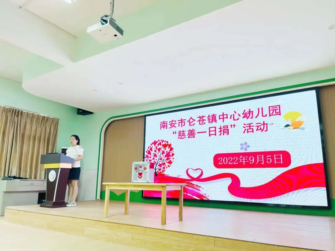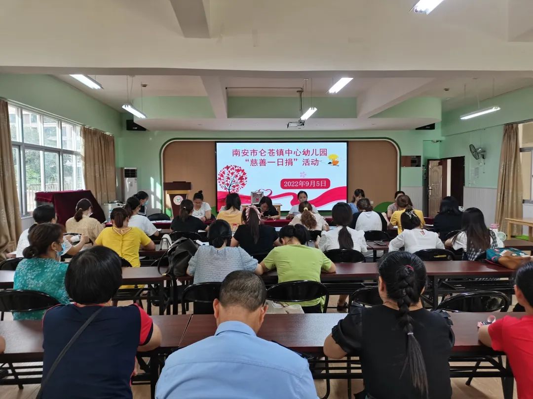 为弘扬和传承“爱国、爱乡、爱业、爱俭”的南安华侨精神、培育和践行社会主义核心价值观,南安市仑苍镇中心幼儿园积极响应市教育局发起的 “慈善一日捐”活动的号召,我园于2022年9月5日下午,在二楼多媒体教室举行了慈善捐款活动,全体教职工参加了此次活动。  首先,周琅琅老师组织大家学习中共南安市委办公室、南安市人民政府办公室《关于印发<2022年南安市“慈善一日捐”活动方案>的通知》(南委办发明电〔2022〕37号)文件精神,并向全体教职工发出“慈善一日捐”的倡议。  伴随着乐曲“只要人人都献出一点爱,世界将变成美好的人间……”在李园长的带领下,大家纷纷踊跃参与,积极捐款。慈善一日捐,爱在点滴间,仑苍镇中心幼儿园教师们以实际行动发扬无私奉献、助人为乐的优良传统。 本次“慈善一日捐”所募捐的款项,将全部捐给南安市慈善总会,用于慈善助学、慈善助残、慈善助医、慈善助困、公益事业和“造血式”慈善扶贫等项目。